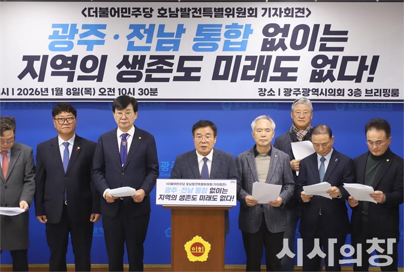 [시사의창=송상교기자] 더불어민주당 호남발전특별위원회는 1월 8일 오전 10시 30분 광주광역시청 3층 브리핑룸에서 광주·전남 행정통합과 관련한 공동 기자회견을 열고 “통합 없이는 지역의 생존도 미래도 없다”며 통합 추진의 필요성을 강하게 호소했다.
