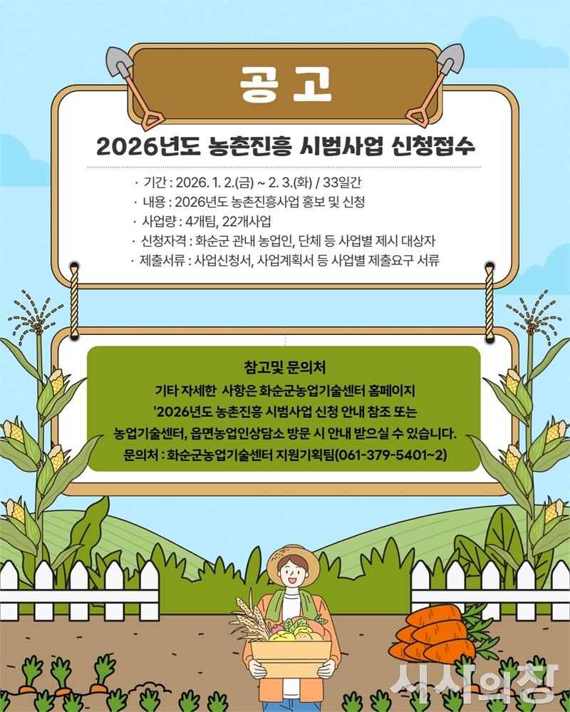 [시사의창=송상교기자] 화순군(군수 구복규)은 "‘소득이 높은 부유 농촌’ 실현과 지역 농업 경쟁력 강화를 위해 ‘2026년도 농촌진흥 시범사업’ 신청을 오는 2월 3일까지 접수한다"고 9일 밝혔다.