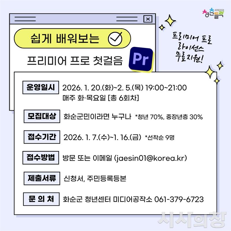 [시사의창=송상교기자] 화순군(군수 구복규)은 "오는 20일 오후 7시 화순군 청년센터(청춘들락) 미디어공작소에서 화순군민을 대상으로 ‘프리미어프로 첫걸음’ 영상 제작 교육을 실시한다"고 9일 밝혔다.
