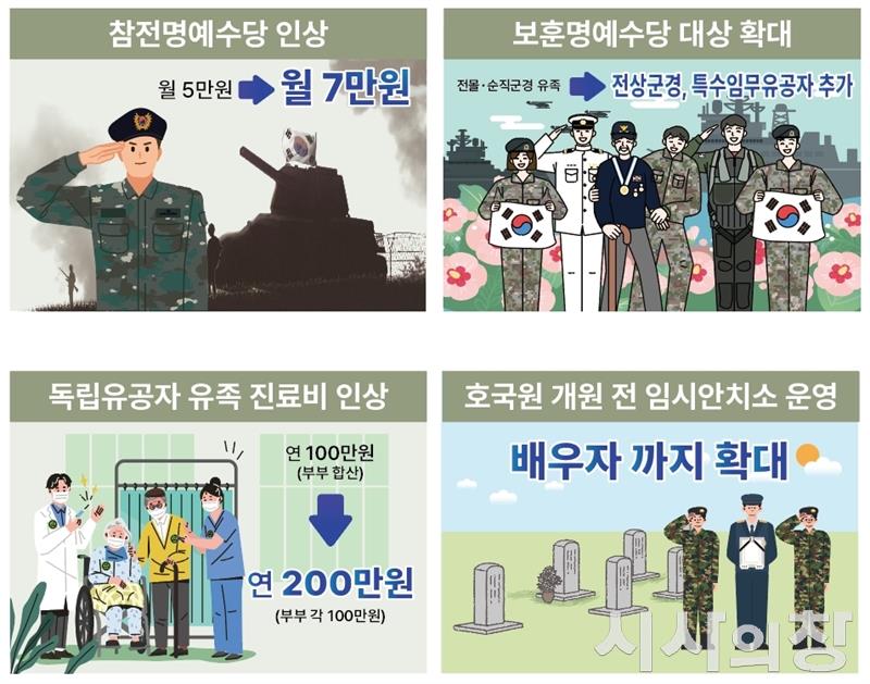 이에 따라 6·25전쟁과 월남전 참전유공자의 명예를 기리고 생활 안정을 돕기 위해 참전명예수당을 기존 월 5만 원에서 7만 원으로 인상한다. 단계적 인상을 통해 고령의 참전유공자들이 보다 안정적인 생활을 이어갈 수 있도록 지원한다는 취지다.