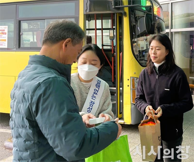장성군이 계속되는 독감(인플루엔자) 유행에 각별히 주의해 줄 것을 당부했다.사진은 장성군 보건소 공무원들이 장성공영버스터미널에서 독감 예방 수칙을 안내하고 있다.[시사의창=송상교기자]