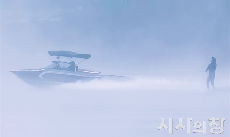 물안개 가득한 이른 아침, 우륵대교 아래서 한 남성이 수상스키를 타고 있는 모습./사진=정용일 기자