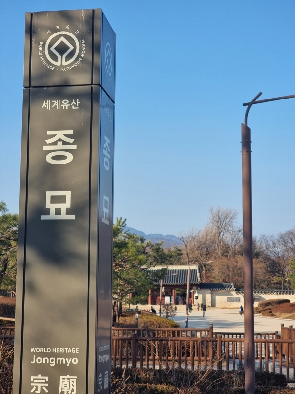 종묘 앞 종묘가 세계유산임을 알리는 입간판이 세워져 있다.