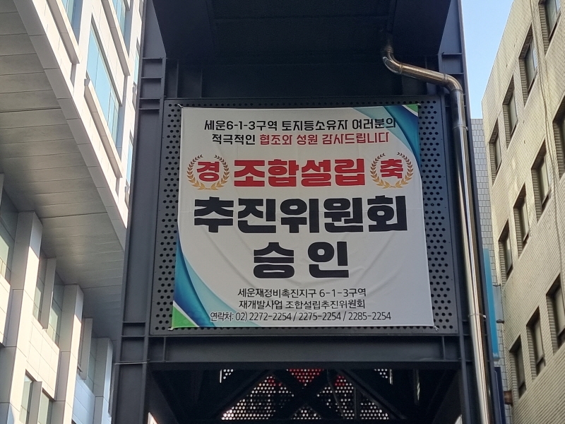 세운상가 공중보행로 주변 곳곳에 조합설립 추진위원회 설립을 축하하는 현수막이 붙어 있다.