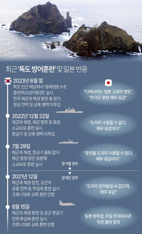 일본과의 관계 복원을 모색하던 윤석열 정부가 일본을 자극하지 않으려 눈치를 보았고, 한미일 3각 동맹 복원을 중시하던 미국 바이든 대통령의 기조에 보폭을 맞추려다 보니 윤석열 정부가 독도 방어훈련 규모를 대폭 축소해 버렸다.