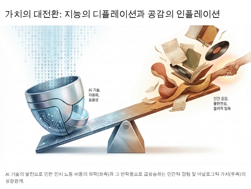 2025년의 거시경제 지표와 문화적 현상은 인류 역사상 전례 없는 거대한 역설을 가리키고 있다. 생성형 인공지능(Generative AI)의 폭발적인 진화는 텍스트, 이미지, 영상, 코딩 등 지적 노동의 결과물을 무한에 가깝게 복제하고 생산해낼 수 있는 능력을 인류에게 부여했다. 맥킨지(McKinsey)의 ‘2025 AI 현황 보고서’가 지적하듯, 기업들은 화이트칼라 직무에서 AI 도입을 통해 실질적인 비용 절감을 실현하고 있으며, 이러한 효율성 증대는 제조 및 유통 전반에 걸쳐 연간 소비자물가지수(CPI)를 0.5~0.7%포인트 낮추는 디플레이션 압력으로 작용하고 있다. 바야흐로 ‘지능(Intelligence)’의 한계비용이 0으로 수렴하는 시대가 도래한 것이다.