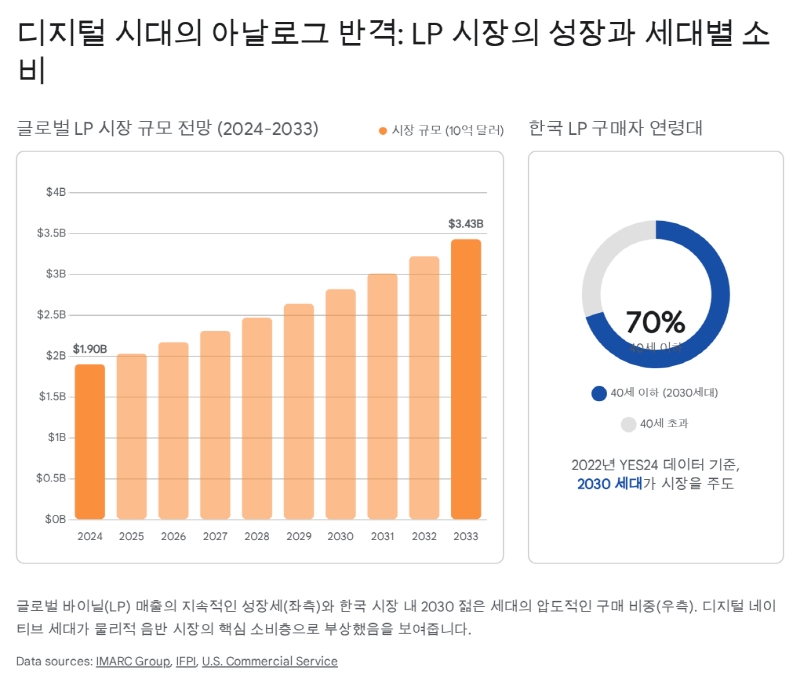 음악 산업에서 LP의 부활은 일시적 유행을 넘어 구조적 변화로 자리 잡았다. 국제음반산업협회(IFPI)의 2025년 보고서에 따르면, 전 세계 LP 매출은 18년 연속 성장을 기록했다. 스트리밍이 전체 매출의 69%를 차지하며 시장을 지배하고 있지만, 물리적 음반 시장의 하락세 속에서도 LP만은 독보적인 성장세를 보인다.