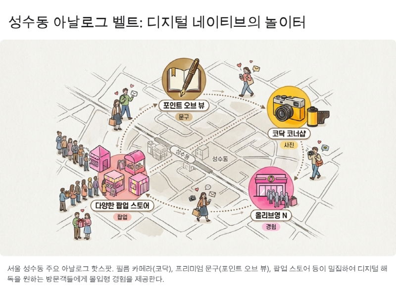 서울 성수동은 이러한 ‘아날로그 트렌드’가 집약된 거대한 실험실이다. 타임아웃(Time Out)이 ‘세계에서 4번째로 쿨한 동네’로 선정한 이곳은 낡은 공장 지대와 최첨단 팝업 스토어가 공존하며 독특한 공간감을 형성한다.