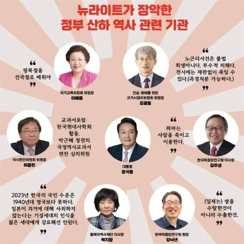 그림표에 있는 기관장 외 안창호 국가인권위원회 위원장(내란수괴 윤석열의 인권을 존중하고 여성을 폄하, 성희롱 발언)과 김용원 위원(헌재 탄핵 인용시 부수자. 는 SNS 기록) 독립기념관장 김형석(광복절이 건국절이며 해방은 연합국의 선물이라고 발언) 등이 있다. 이들의 역사 인식은 일베나 펨코의 10~ 20대의 친일 역사 인식, 약자 혐오와 강자에 공감, 여성 혐오 인식, 군사쿠데타 전땅크의 마초 동경, 군부독재 찬양, 인권 의식 결여 등과 상당 부분 겹쳐진다. 이들은 왜곡된 역사 인식과 사회적 슬픔에 공감 능력이 없는 짝퉁 보수진영의 사이버 정책과 결합되며 오늘의 지경에 이르렀다.