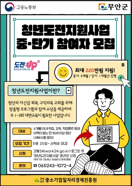 [시사의창=장성대 기자]전남 무안군(군수 김산)이 8월 25일부터 ‘2025년 청년도전지원사업’ 중·단기 참여자를 모집한다. 이번 사업은 지난 2월 고용노동부 공모에 최종 선정된 뒤 전라남도중소기업일자리경제진흥원이 수행기관으로 지정되면서 본격적으로 추진된다.사업 대상은◆구직단념청년◆자립준비청년◆청소년복지시설 입·퇴소 청년