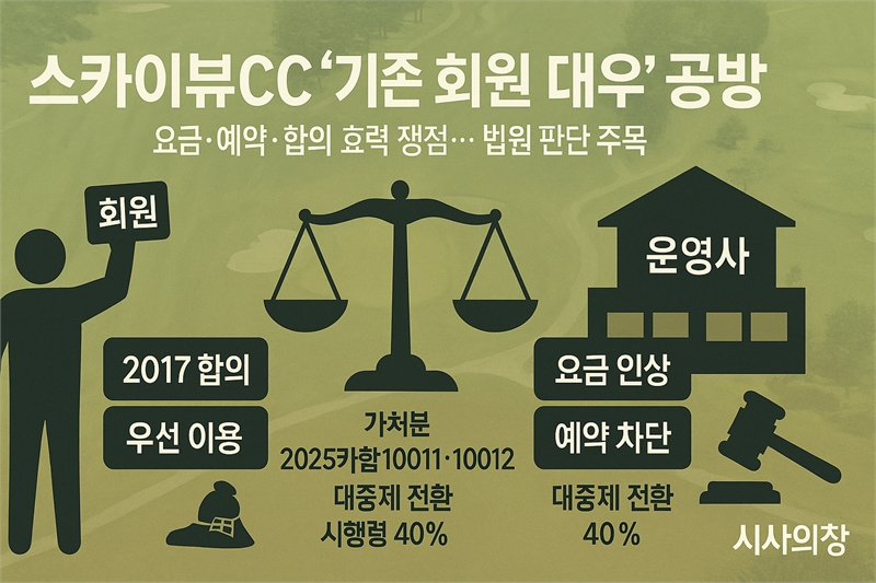 [시사의창=이태헌 기자]경남 함양군 서상면 ‘스카이뷰CC’가 회생절차를 거쳐 운영주체가 바뀌고 대중제로 전환되는 과정에서, 인수 측이 기존 회원(유사회원)에 대한 약속을 지키지 않았다는 이유로 회원들이 집단 소송에 나섰다.창원지방법원 거창지원에는 2025카합10011 ‘골프장 이용요금 인상 효력정지’ 가처분과 2025카합