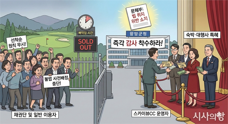 [시사의창=이태헌 기자] 경남 함양군의 대중제 골프장인 스카이뷰CC(운영자 ㈜케이엔스카이뷰홀딩스)가 체육시설법을 위반하여 편법적인 예약 운영을 해왔다는 의혹이 제기되어 파장이 일고 있다.기존 채권자와 이용자들로 구성된 청구인단은 함양군에 철저한 감사와 행정조사를 촉구하고 나섰다. ◇ "선착순 원칙 무시하고 숙박·대행사에