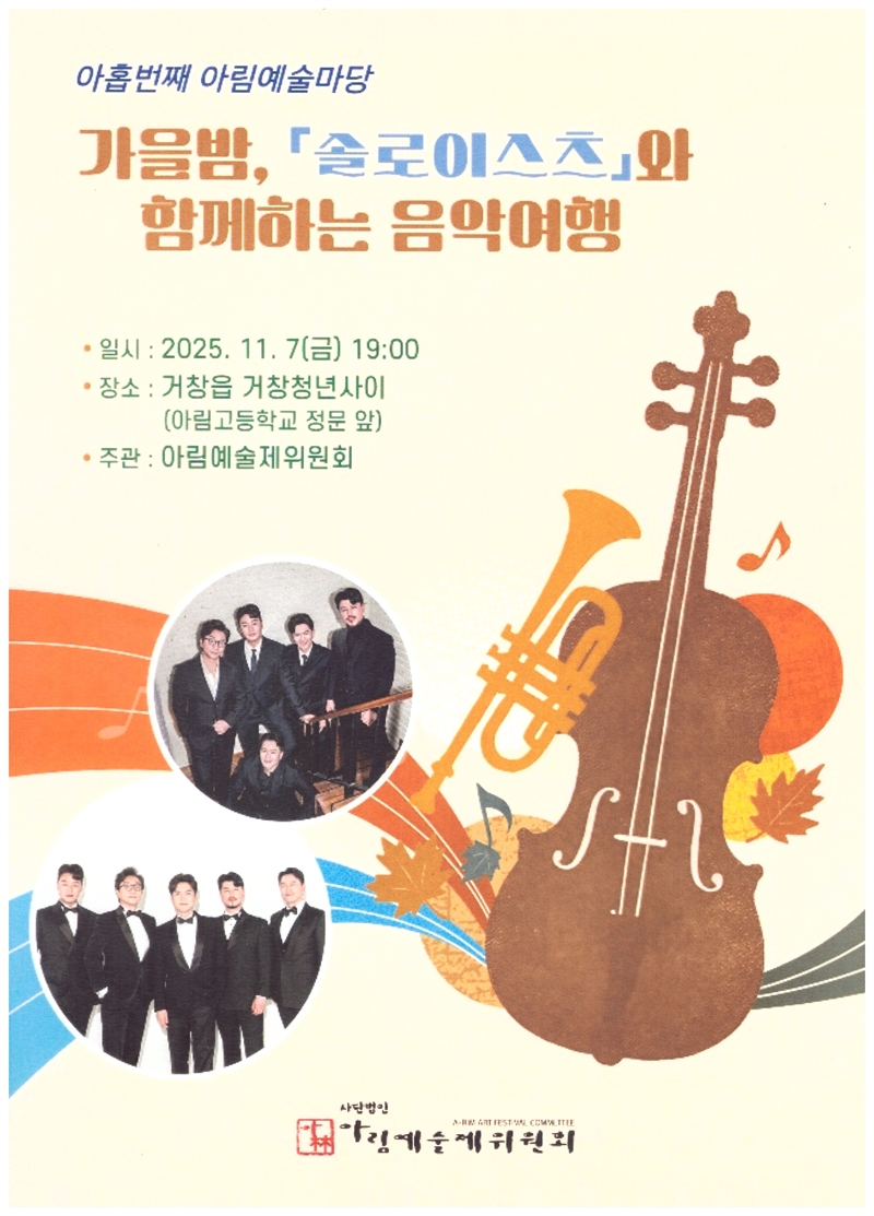 [시사의창=이태헌 기자]사단법인 아림예술제위원회(위원장 김칠성)가 가을 정취를 담은 음악회 ‘솔로이스츠와 함께하는 음악여행’을 11월 7일(금) 저녁 7시, 청년사이(아림고 정문 앞)에서 개최한다. 지역 주민과 방문객이 함께 어우러지는 야간 공연으로, 깊어가는 계절에 맞춘 감성적인 무대를 예고했다.이번 음악회는 솔로 연주