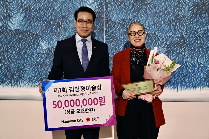 [시사의창=소순일기자] 남원시(시장 최경식)는 15일 남원시립김병종미술관에서 ‘제1회 김병종 미술상 시상식’을 열고, 첫 수상자로 윤진미(Jin-me Yoon) 작가를 선정해 상을 수여했다. 윤진미 작가는 수상 소감을 통해 “인류가 직면한 기후 위기 시대에 생명과 자연에 대한 경외의 정신을 담은 김병종 미술상을 받게 되어