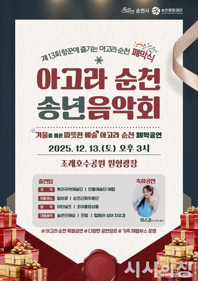 [시사의창=신민철 기자] 순천문화재단은 "2025년 한 해를 마무리하며 지역 예술인과 시민이 함께 만들어온 ‘제13회 항꾼에 즐기는 아고라 순천 폐막식_송년음악회’를 오는 13일 오후 3시 조례호수공원 원형광장에서 개최한다"고 11일 밝혔다.이번 폐막식은 연말을 맞아 시민 모두가 함께 즐기는 열린 축제로 마련된다. 행사는