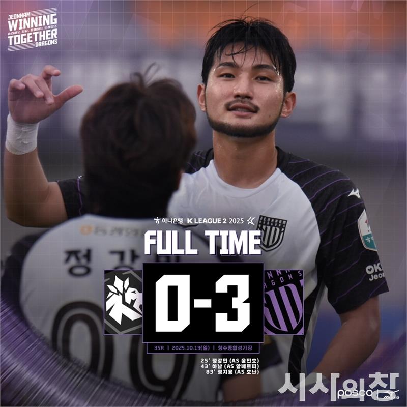 [시사의창 = 송상교 기자] 전남드래곤즈가 충북청주FC 원정 경기에서 완벽한 경기력을 선보이며 귀중한 승점 3점을 따냈다. 지난 26라운드 안산전 이후 9경기 만에 무실점 승리를 거두며, 최근 5경기 4승 1패로 상승세를 이어가고 있다. 전남은 10월 19일 오후 4시 30분 청주종합경기장에서 열린 하나은행 K리그2