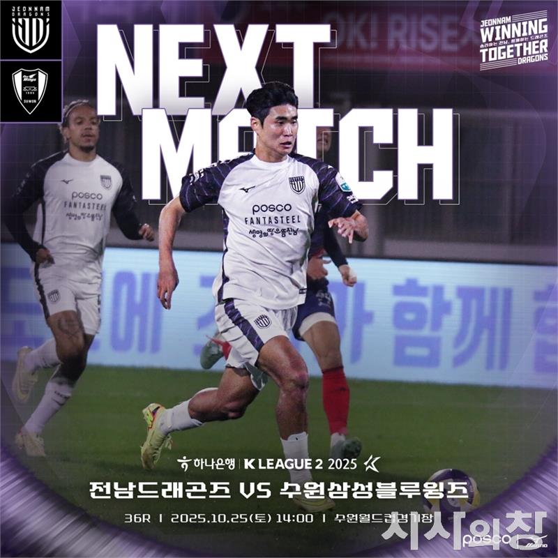[시사의창=송상교기자] K리그2 전남드래곤즈가 리그 상위권 도약을 향한 중대한 승부에 나선다. 전남드래곤즈는 오는 10월 25일 토요일 오후 2시, 수원월드컵경기장에서 열리는 ‘하나은행 K리그2 2025’ 36라운드 원정 경기에서 수원삼성블루윙즈를 상대로 연승과 3위 탈환에 도전한다. 전남드래곤즈는 최근 5경기에서