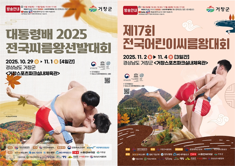 [시사의창=이태헌 기자] 거창군은 대한씨름협회가 주최하고 거창군씨름협회가 주관하는 ‘대통령배 2025 전국씨름왕선발대회’와 ‘제17회 전국어린이씨름왕대회’를 10월 29일부터 11월 4일까지(7일간) 거창스포츠파크 실내체육관에서 연속 개최한다고 밝혔다.‘대통령배 2025 전국씨름왕선발대회’는 10월 29일~11월 1일(4