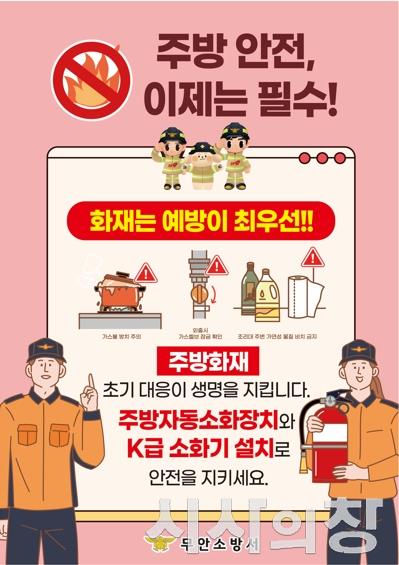 [시사의창 = 송상교 기자] 무안소방서(서장 안철수)는 "겨울철을 맞아 증가하는 주방 화재에 선제 대응하기 위해 K급 주방소화기와 주방자동소화장치 설치 홍보를 집중 전개하고 있다"고 7일 밝혔다.주방 화재는 식용유 과열 등으로 발생하는 사례가 많아 일반 소화기로는 진압이 어려운 경우가 적지 않다. 이에 무안소방서는 기름