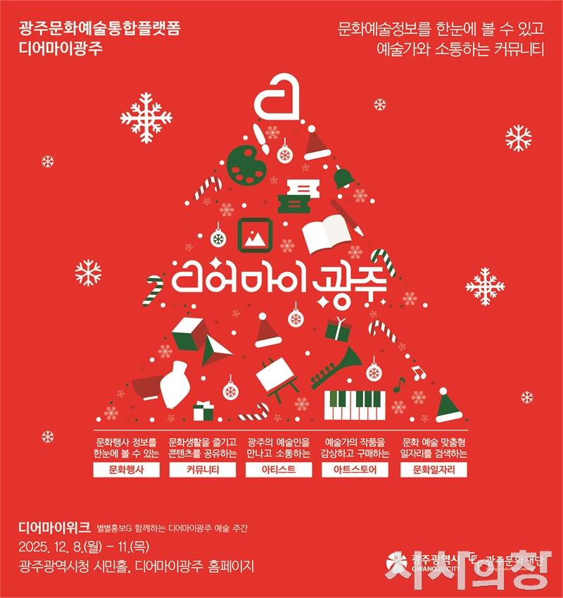 [시사의창=송상교기자] 광주문화재단은 "광주문화예술통합플랫폼 ‘디어마이광주’의 오프라인 축제 ‘디어마이위크’를 12월 8일부터 11일까지 광주광역시청 1층 로비에서 개최한다"고 7일 밝혔다.이번 행사는 문화예술과 시민 참여를 결합해 지역 홍보·예술 활성화의 새로운 모델을 제시하는 데 의의를 두고 있다. 올해 디어마이위크