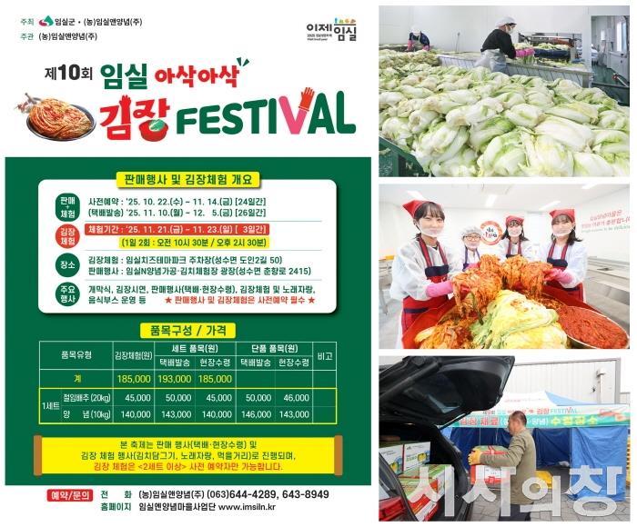 [시사의창=소순일기자] 청정임실의 대표 겨울 축제인 ‘임실 아삭아삭 김장페스티벌’이 주문 쇄도로 조기 마감되는 등 뜨거운 인기를 이어가고 있다. 임실군에 따르면 오는 11월 21일부터 23일까지 임실치즈테마파크에서 열리는 이번 행사의 김장체험 사전접수는 모집 9일 만에 300팀이 모두 마감돼 완판됐다. 현장에서 직접