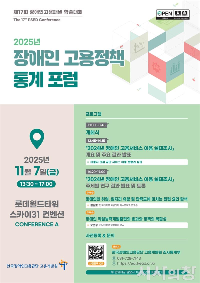 [시사의창=송상교기자] 한국장애인고용공단 고용개발원(원장 직무대행 최종철)은 "오는 11월 7일 오후 1시 30분 서울 잠실 롯데월드타워 스카이31 컨벤션에서 「2025년 장애인 고용정책 통계 포럼」을 개최한다"고 3일 밝혔다. 이번 행사는 공단의 주요 고용서비스 이용 실태를 분석하고, 장애인 고용정책의 실효성