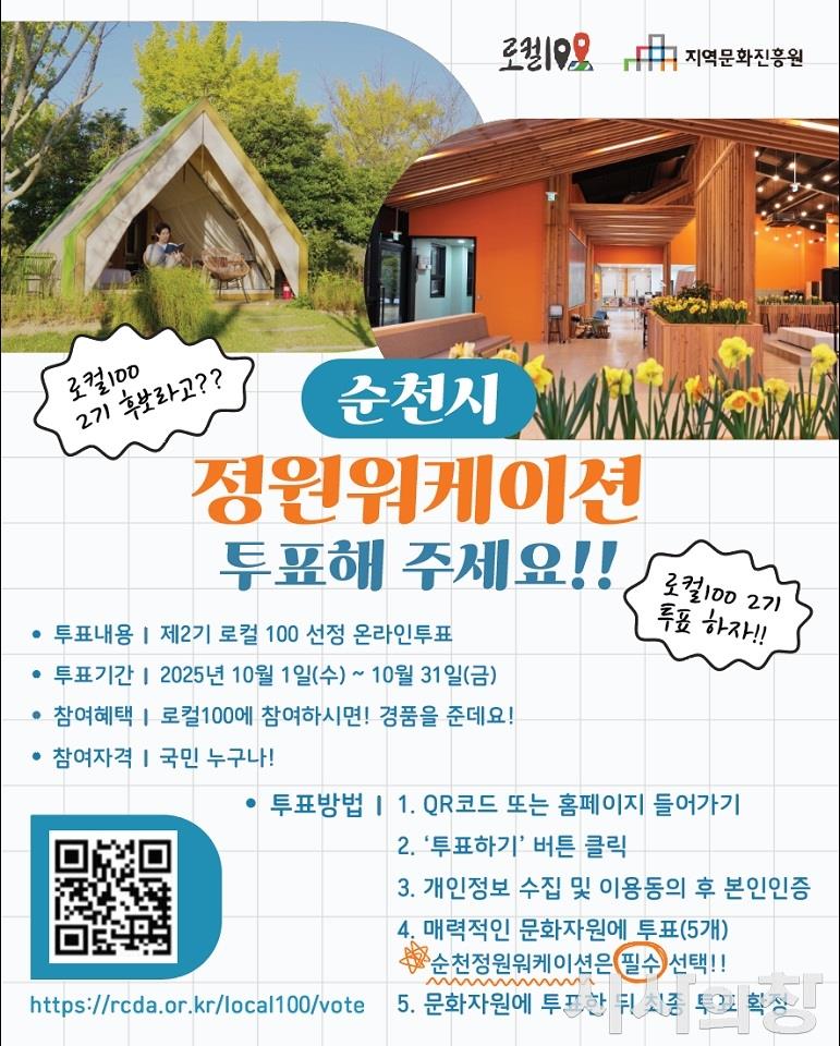 [시사의창=신민철기자] 순천시(시장 노관규)는 "문화체육관광부가 주관하는 ‘제2기 로컬 100’ 지역문화공간 부문에 순천 정원워케이션이 후보로 선정됐다"고 29일 밝혔다. ‘로컬 100’은 전국 각 지역을 대표하는 매력적인 문화자원 100곳을 발굴해 홍보하는 사업으로, 지역의 특색 있는 공간과 문화를 널리 알리기 위해