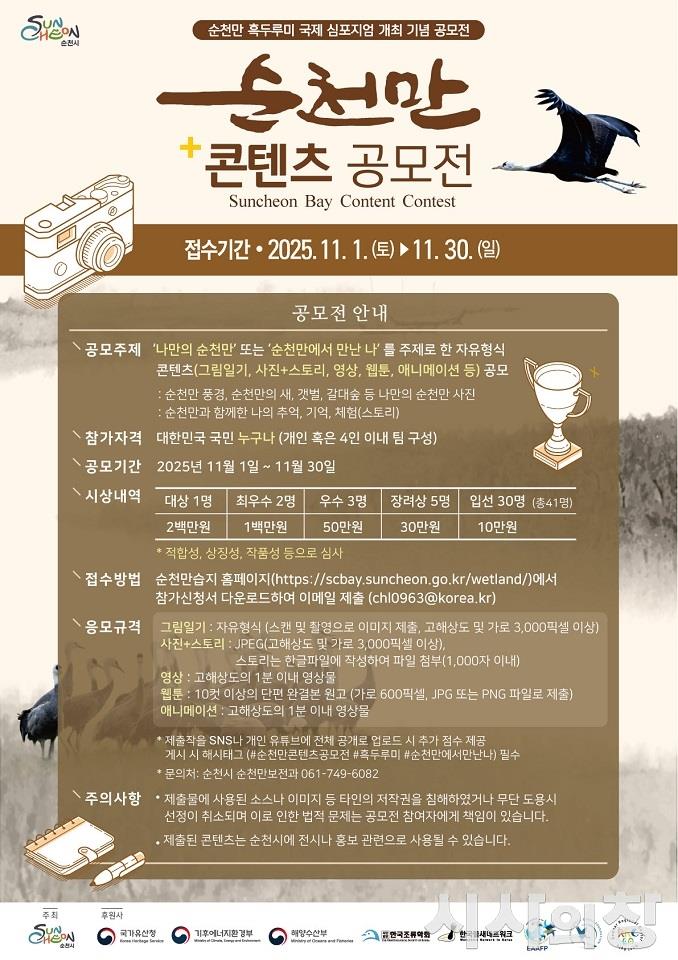 [시사의창=신민철 기자] 순천시(시장 노관규)가 국내 기초지자체 최초로 세계자연보전연맹(IUCN)에 가입한 것을 기념해, 오는 11월 1일부터 30일까지 한 달간 ‘순천만 콘텐츠 공모전’을 개최한다. 이번 공모전은 시민과 관광객이 바라본 순천만의 아름다움과 감동의 순간을 창의적 콘텐츠로 표현해, 세계적 생태도시로서 순