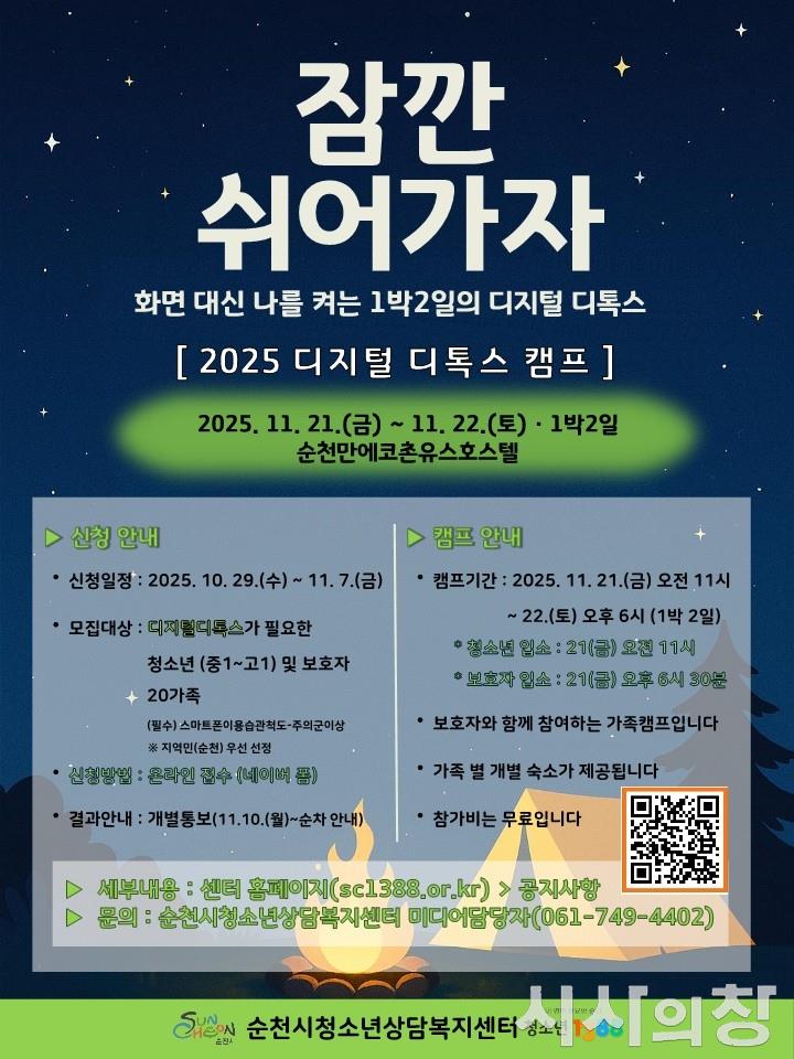 [시사의창=신민철 기자] 순천시(시장 노관규)가 청소년의 건강한 미디어 사용습관을 형성하고 가족 간 소통을 강화하기 위해 「2025년 청소년 디지털 디톡스 캠프」를 오는 11월 21일부터 22일까지 1박 2일간 순천만에코촌 유스호스텔에서 운영한다. 이번 캠프는 빠르게 확산되는 디지털 의존 현상 속에서 청소년들이 스스로