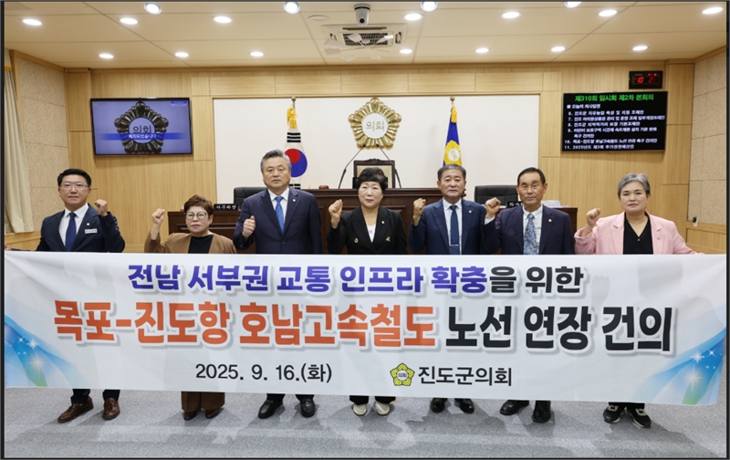 [시사의창=장성대 기자]진도군의회(의장 박금례)가 제310회 임시회에서 「목포-진도항 호남고속철도 노선 연장 건의안」을 채택하며 지역 광역교통망 개선에 힘을 실었다. 이번 건의안은 호남고속철도 목포–진도항 구간을 제5차 국가철도망 구축계획에 반드시 반영해야 한다는 내용을 담고 있다.전남 서부권은 광주–강진–완도 고속도로