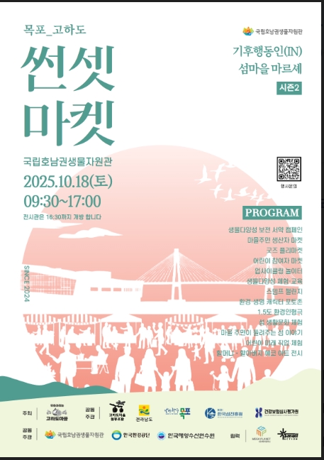[시사의창=장성대 기자]기후에너지환경부 산하 국립호남권생물자원관(관장 박진영)은 섬마을 주민들과 8개 기관이 함께하는 ‘2025년 기후행동인(IN) 고하도 썬셋 마켓’을 10월 18일 오전 9시 30분부터 오후 5시까지 목포시 고하도에 위치한 국립호남권생물자원관 야외정원에서 개최한다고 13일 밝혔다.올해로 두 번째를 맞는