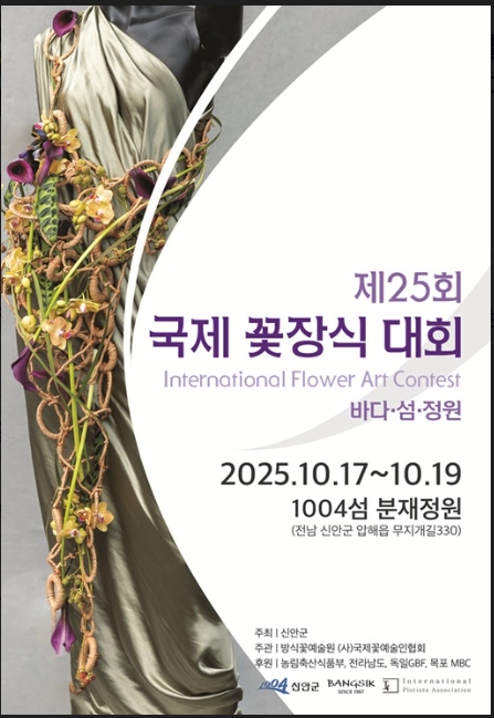 [시사의창=장성대 기자]대한민국 K-플라워 예술의 중심지로 떠오르는 전남 신안군에서 ‘제25회 국제꽃장식대회’가 10월 17일부터 19일까지 3일간 압해읍 1004섬 분재정원에서 열린다.2001년 시작된 국제꽃장식대회는 올해로 25주년을 맞이했다. 대회는 국내외 최고 수준의 플로리스트와 전공 학생들이 예술적 기량을 겨루는