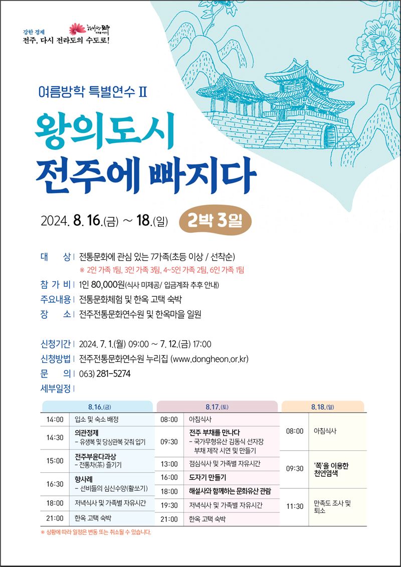전주전통문화연수원은 오는 8월 여름방학을 맞아 전통문화에 관심 있는 가족을 대상으로 특별 연수 프로그램인 ‘왕의도시 전주에 빠지다’를 운영한다.