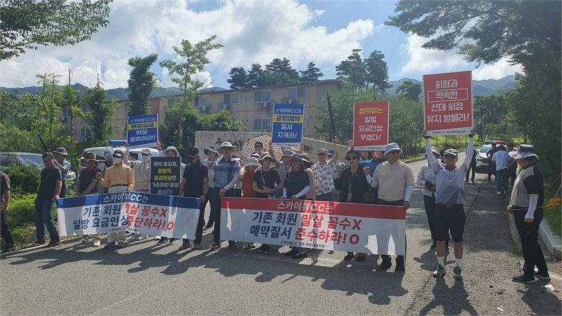 이 골프장 기존 회원 80여 명은 7일 함양군 서상면 대남리 스카이뷰CC 골프장 입구에서 골프장 측의 일방적인 요금인상과 예약질서를 지키지 않는 횡포를 중단할 것을 요구하며 규탄 집회를 가졌다.