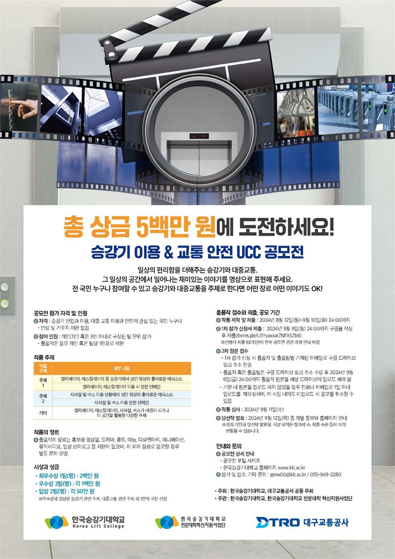 이번 영상 공모전은 대구교통공사와의 협약을 통해 공동 주최 형식으로 치러지며 한국승강기대학교 혁신지원사업단이 주관하게 된다.