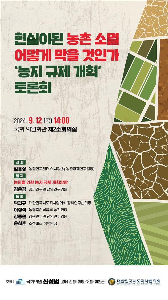 [시사의창=이태헌 기자]신성범 국회의원(국민의힘, 산청군, 함양군, 거창군, 합천군)이 대한민국 시도지사협의회(협의회장ㆍ부산시장 박형준)와 공동으로 9월 12일(목) 오후 2시 국회의원회관 제2소회의실에서‘농지 규제 개혁 토론회’를 개최한다.