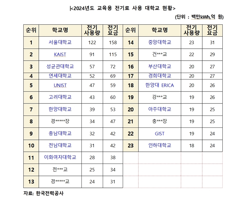 국회 과학기술정보방송통신위원회 소속 신성범 의원(국민의힘, 경남 산청ㆍ함양ㆍ거창ㆍ합천군)이 한국전력공사로부터 제출받은‘전국 대학교별 교육용 전기 사용량 현황’에 따르면 , AI 대학원 등 AI 중점대학교로 선정된 19곳 중 17곳 학교의 전기료 사용량이 전국 424개 대학교 중 전기료 사용량 상위 5%를 차지하는 것으로 나타났다고 8일 밝혔다.