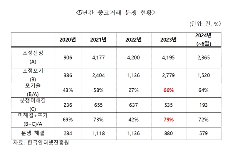 중고거래 분쟁에 따른 조정신청이 늘어났지만, 지난해 조정 과정에서 철회, 당사자 연락두절 등에 따른 불능 등 포기건 수가 2,779건, 분쟁 조정 절차거부 등 미해결 건수가 535건으로 전체 79% 수준에 달한다.