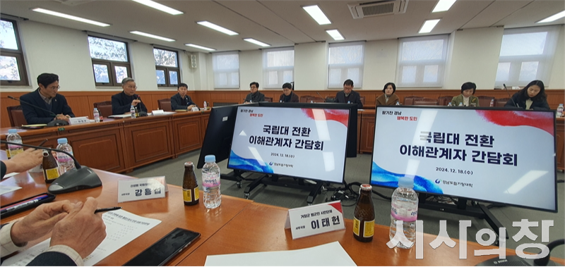 [시사의창=이태헌 기자]경남도가 주관한 거창대학 국립대 전환 이해관계자 간담회가 18일 오후 3시 거창대학에서 경남도청 하정수 교육인재과장과 김재구 거창대학 총장, 김일수 도의원, 이병철 부군수 지역 시민단체 관계자 등이 참석한 가운데 열려 통합신청서 반영사항 등에 대한 설명이 있었다.