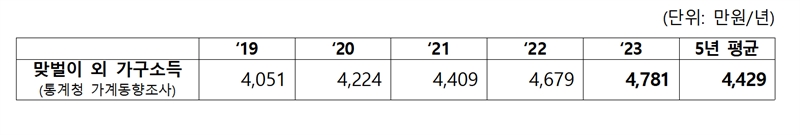 기준액 상향을 위한 세부 통계 자료로는 가계동향조사상 맞벌이 외 가구소득을 기준으로 하는 것이 타당한 것으로 봤다. 신성범 의원실이 전문가 등 관계기관과 검토한 결과 공익직불금은 신청자 본인의 소득만을 기준으로 삼기 때문에 가계동향조사상 단독ㆍ홀벌이 가구 등의 소득 기준인 맞벌이 외 가구(주소득자 1인)의 소득의 5년 평균치인 약 4,400만원 수준을 농외소득 제한 기준으로 고려할 필요가 있다는 것이다.