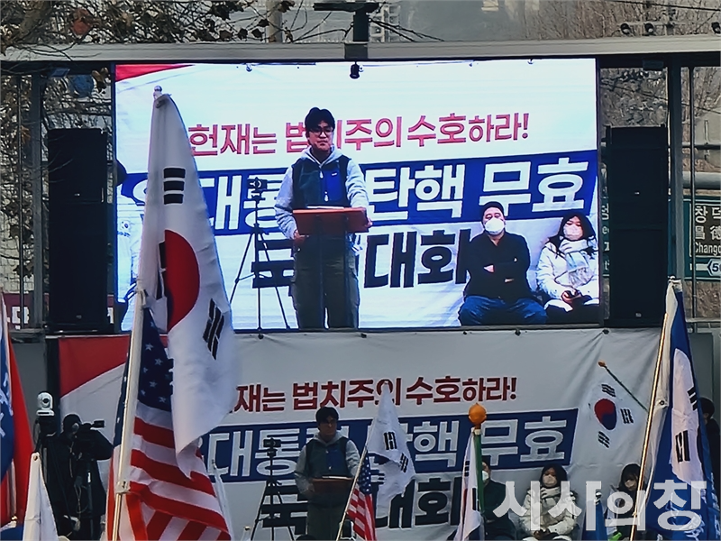 윤석열 대통령에 대한 탄핵심판 3차 변론기일이 열린 21일 서울 종로구 헌법재판소 인근 3호선 안국역 5번출구 앞에서 열린 탄핵 반대 집회에서 연단에 오른 참가자가 '평화시위'를 강조하고 있다./사진=정용일 기자