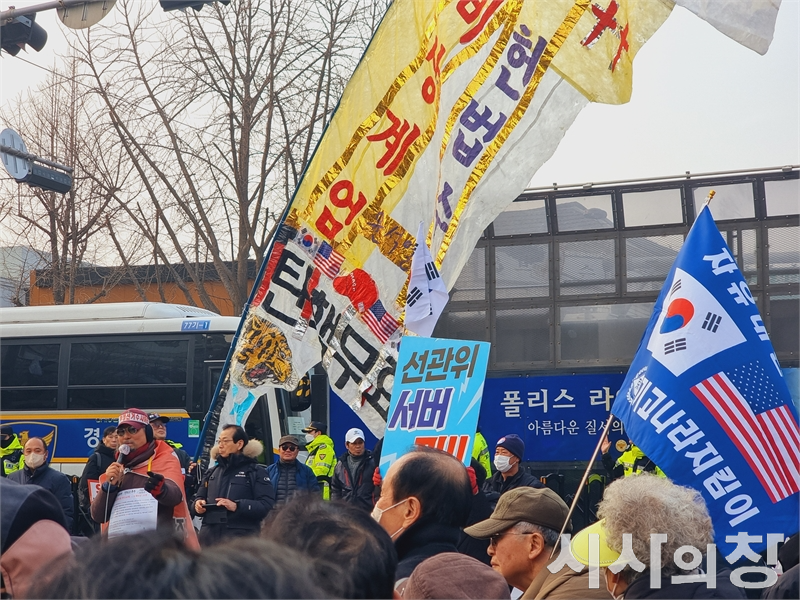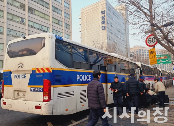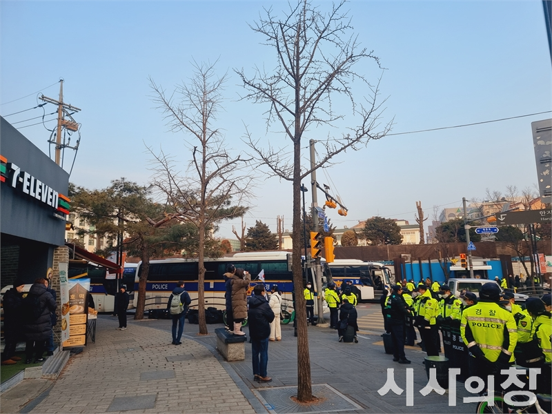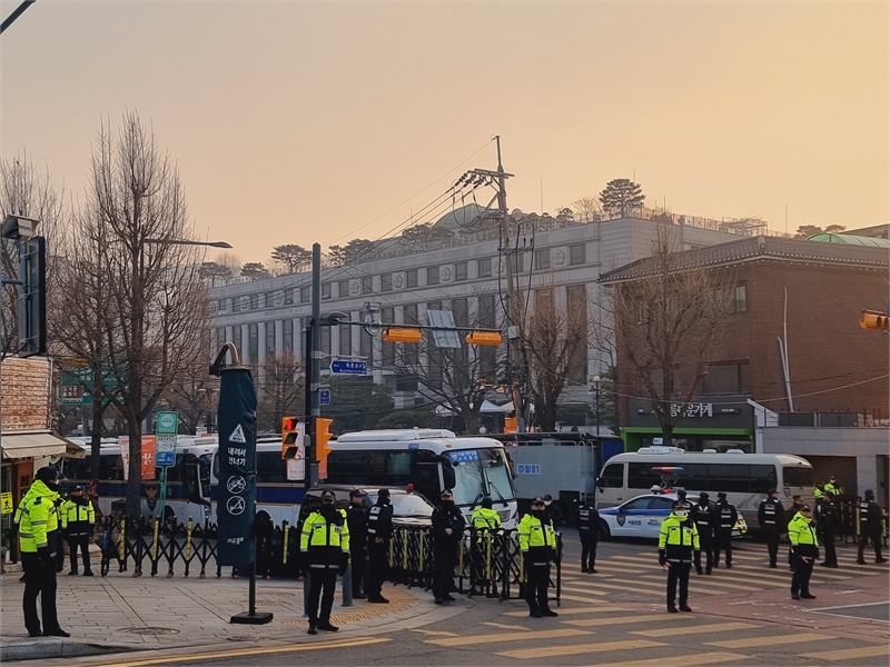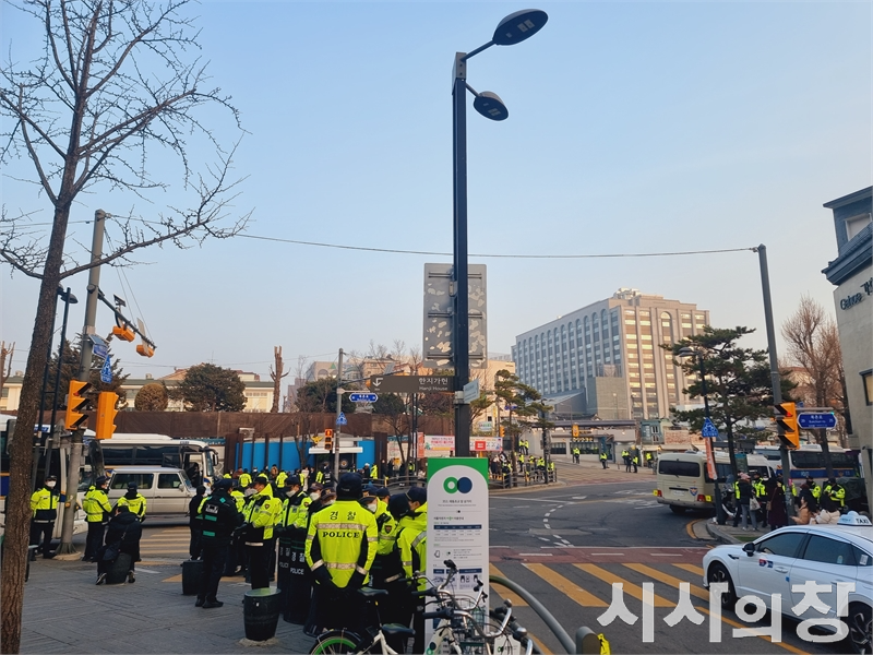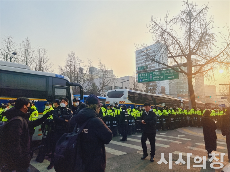[시사의창=정용일 기자] 헌정사상 최초로 현직 대통령이 헌법재판소 탄핵 심판 변론기일에 출석한 21일, 서울 종로구 헌법재판소 인근은 긴장감이 최고조에 달했다. 경찰은 전날 서울서부지방법원에서 발생한 폭동 사태의 여파로 헌재 주변에 4,000여 명의 경찰력을 배치하고, 신체 보호복과 캡사이신 분사기 등을 준비하며 만일의 사태에 철저히 대비했다. 헌재 주변 곳곳에는 수많은 경찰들이 헌재와 연결되는 골목길까지 완전히 차단한 상태였고, 족히 100여대가 넘는 경찰버스가 동원되어 헌재 주변은 차벽으로 완전히 둘러싸였다. 이에 주변을 거닐던 시민들의 거센 항의가 곳곳에서 이어졌다.