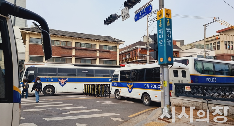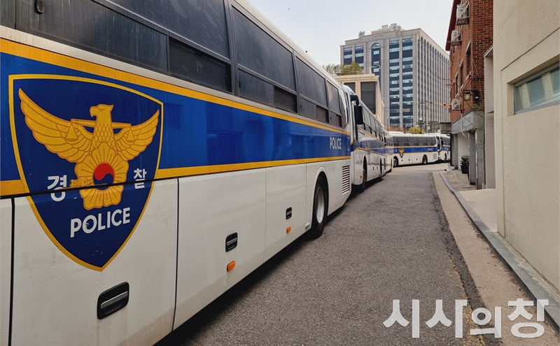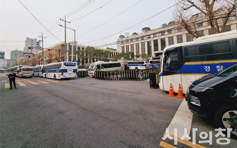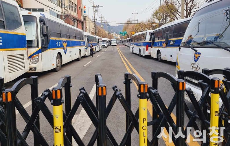 9일 오후 헌재 주변 곳곳에는 아직도 경찰버스 100여대와 수많은 경찰들이 곳곳에 배치되어 있다./사진=정용일 기자