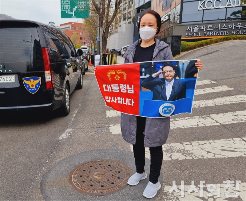 9일 오후 윤석열 전 대통령 지지자가 한남동 관저 인근에서 ‘대통령님 감사합니다’ 글구가 적힌 현수막을 들고 1인 시위를 벌이고 있다.사진=정용일 기자