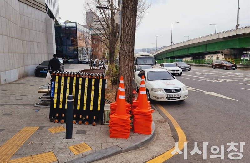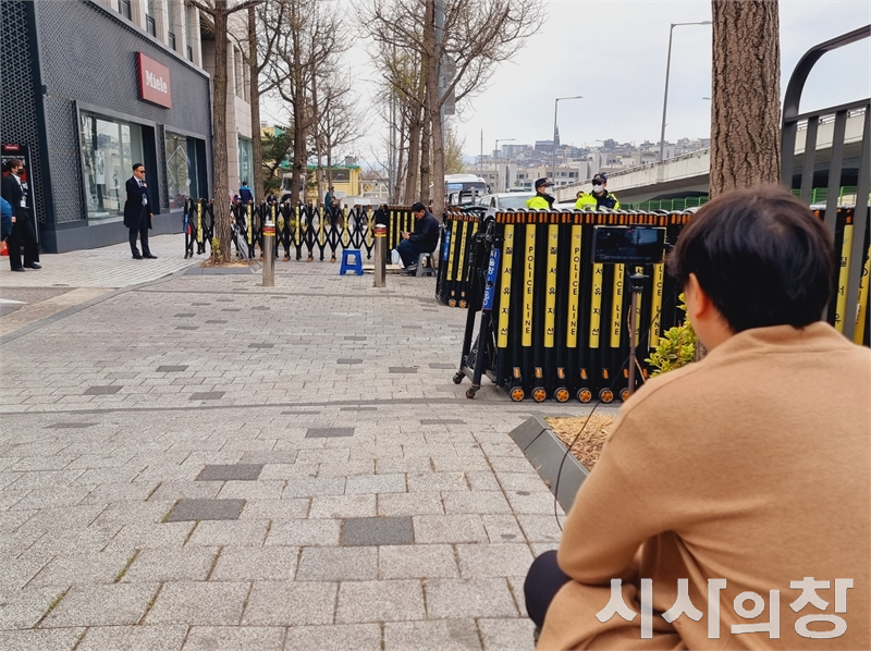 9일 오후 헌재 ㅈ변의 모습. 헌재 앞으로 향하는 인도는 헌재 직원 및 기자 신분확인을 거쳐야만 진입이 가능하다./사진=정용일 기자