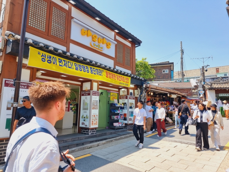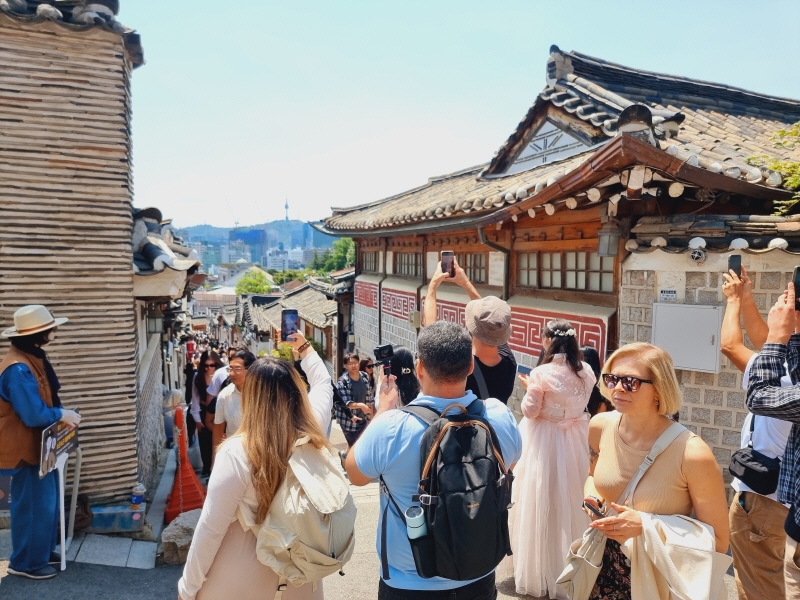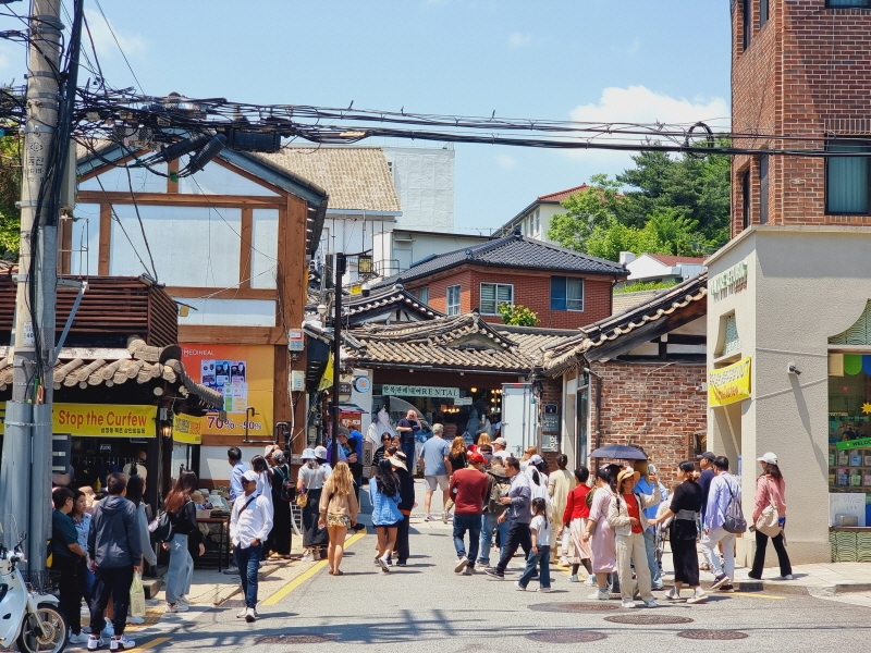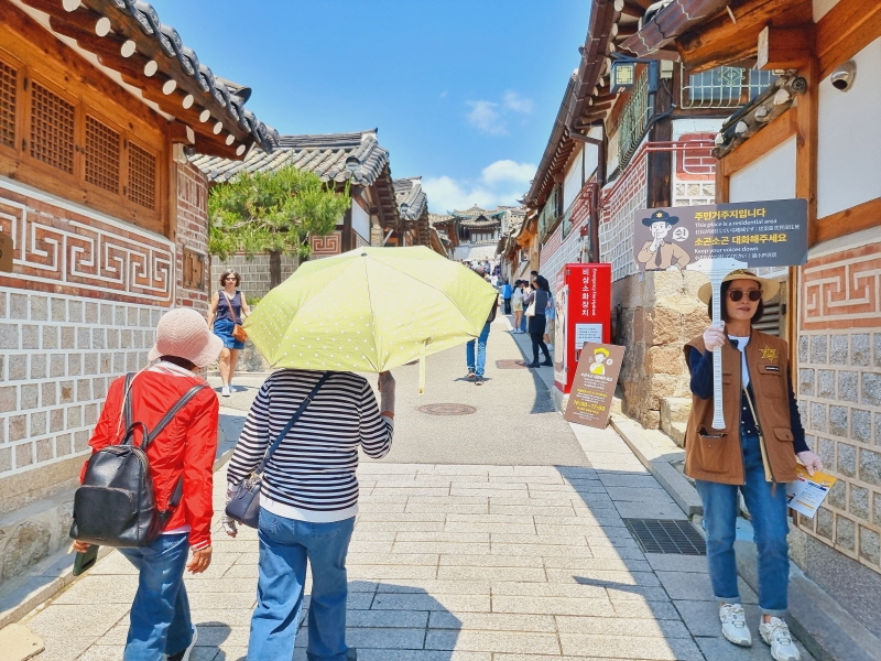 그렇게 잡음이 끊이질 않았던 곳에 변화의 바람이 불기 시작했다. 그래서 그곳으로 발걸음을 옮겨 보았다. 2025년 6월 26일 오후 2시, 서울 종로구 가회동 북촌한옥마을. 맑은 하늘 아래 여느 때처럼 국내외 관광객들로 북새통을 이뤘다. 정확히 말하자면, 외국인 관광객의 수가 80% 이상은 돼 보였다. 3호선 안국역 2번 출구로 나와 좌측 건너편의 헌법재판소를 지나 15분 정도 북촌로를 따라 직진하다 보면 북촌 한옥마을에 다다른다. 가회동성당을 조금만 지나면 북촌한옥마을 뒤로 남산타워까지 함께 담아낼 수 있는 매우 유명한 사진스폿으로 가는 진입로가 나온다. 누가 보더라도 한옥마을로 진입하는 메인도로라는 것을 알아챌 수 있을 정도의 분위기가 물씬 풍긴다. 하지만 이곳에서 예전과는 다른 모습을 볼 수 있다.