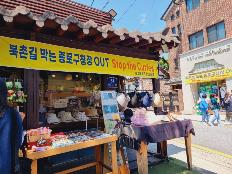 진입로 주변에 모여 있는 다양한 상점들의 입구 위에 ‘북촌길 막는 종로구청장 OUT’이란 문구와 영어로 ‘Stop the Curfew’가 적혀 있는 현수막이 걸려 있다. 인근 또 다른 상점에는 ‘상생이 먼저다! 일방행정 중단하라!’는 문구와 함께 ‘통행제한 원천무효 선언’이라는 문구가 붉은색으로 굵게 적혀 있는 현수막이 걸려 있다. 이곳을 처음 방문한 외국인들은 수많은 상점에 이 같은 항의성 현수막이 내걸려 있는 모습을 보며 갸우뚱해하는 모습이 역력해 보였다. 그래도 주변은 온통 외국인 관광객들로 북새통을 이뤘다. 외국인 관광객들은 전통의상인 한복을 입고 한옥 담벼락 아래서 기념사진 찍기에 여념이 없어 보였다.