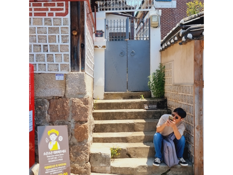 예전보다 단속이 한층 엄격해진 북촌한옥마을이지만, 날이 더워서 그런 건지 주민들이 살고 있는 대문 앞 계단에 앉지 말라는 안내판이 있음에도 다수의 관광객들이 버젓이 여러 집의 대문 앞 계단에 앉아 쉬거나 잡담을 나누고 있었다.
