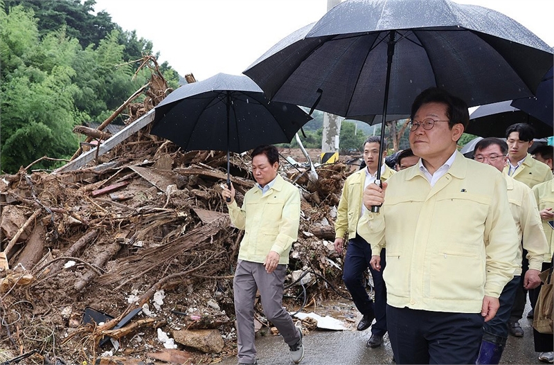 이날 이 대통령은 노란 민방위복 차림에 장화를 신고 우산을 든 채 산청군 산청읍 부리마을 등 토사 유출과 시설물 파괴가 발생한 피해 현장을 점검했다. 이어 산청군에 설치된 호우피해 통합지원본부를 찾아 윤호중 행정안전부 장관, 박완수 경남도지사 등과 대책 회의를 열고, 실종자 수색 및 복구 상황을 보고받았다.