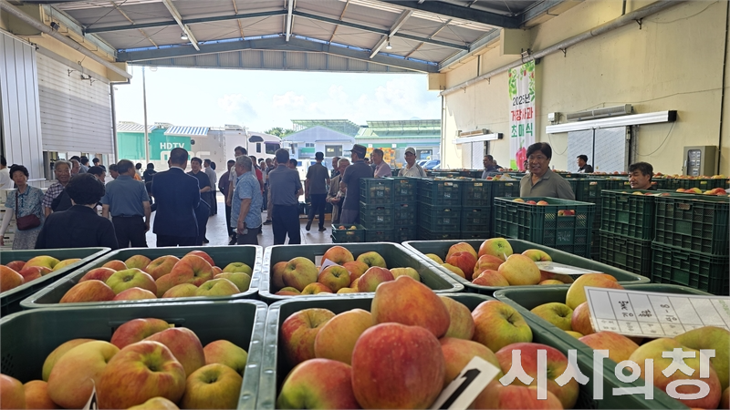 [시사의창=이태헌 기자]경남 거창의 대표 특산물인 거창사과가 올해 첫 출하를 알렸다. 거창사과원예농협은 22일 오전 10시 거창읍 정장리 국농소 거창원협 공판장에서 ‘2025년산 거창 홍로사과 초매식’을 갖고 본격적인 유통을 시작했다.